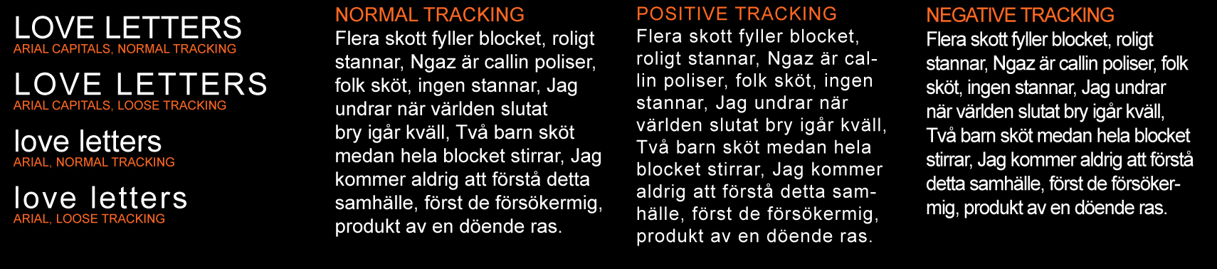 Ajusting the overall space between letters, rather then the space between two letters is know as tracking, also known as letterspacing. It is common practice to letterspace capitals and small capitals, which apear more egal when standing apart. By slightly expanding the tracking across a body of text, the designer can create a more airy field. Negative tracking is rarely desirable. This device should be used sparingly, to adjust one or more lines of justified type.